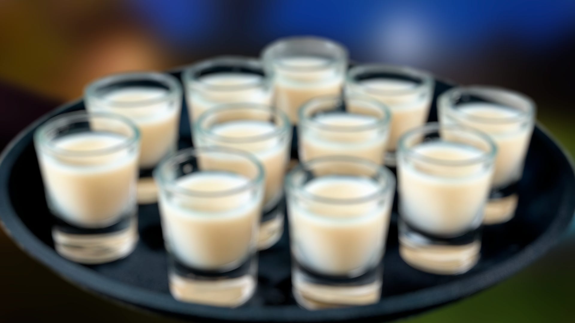 Un camarero se aproxima al grupo con una mano a la espalda y una bandeja llena de vasos de chupito en la otra.